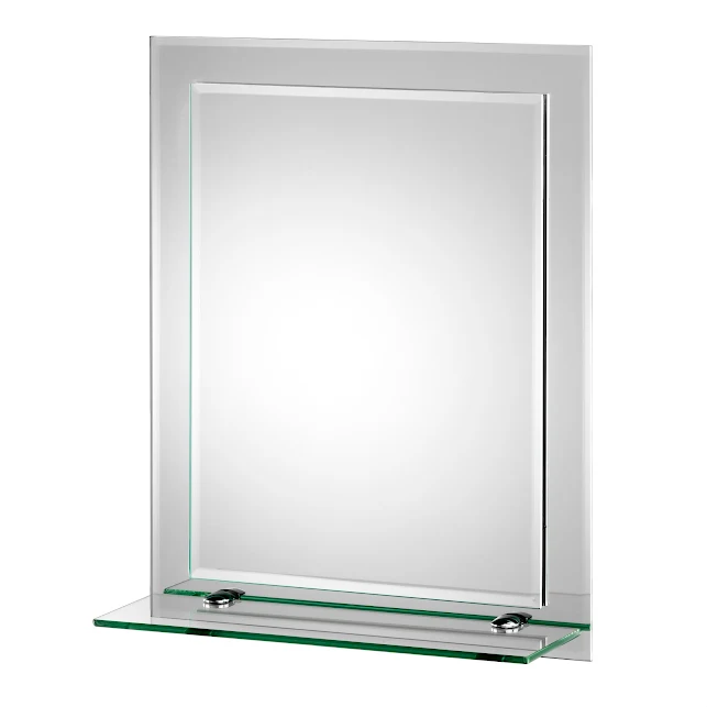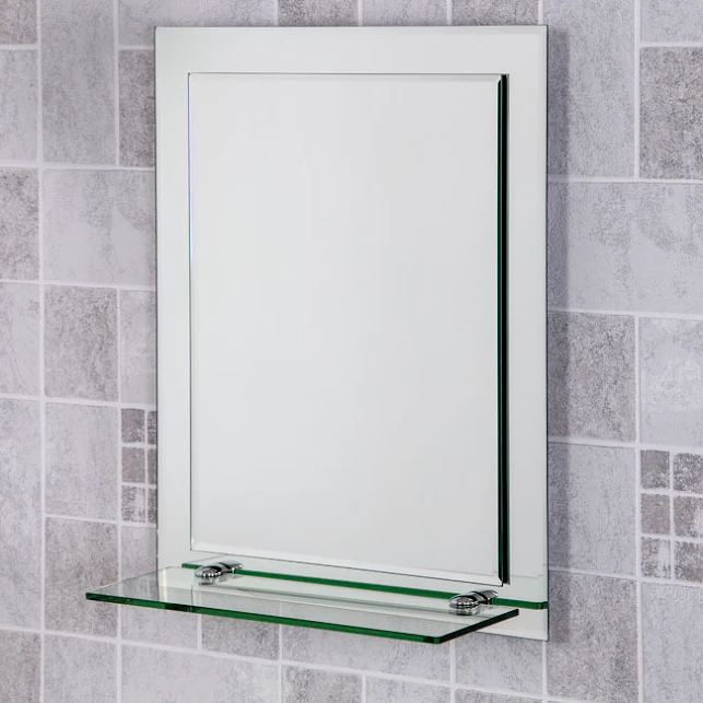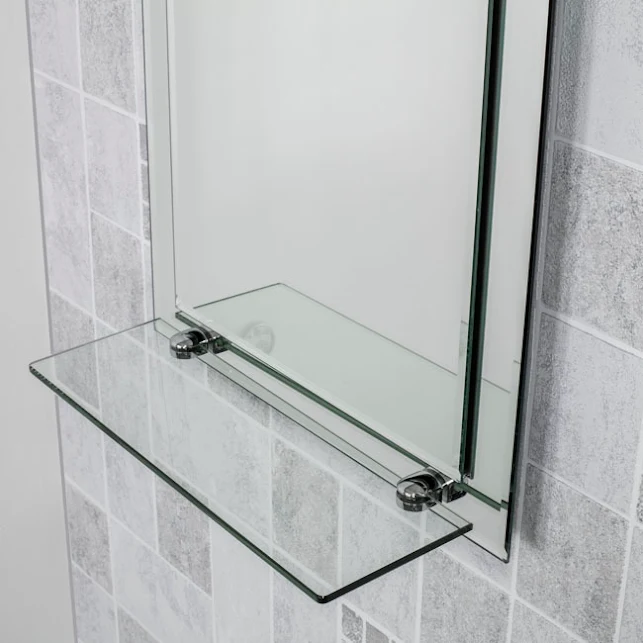 - Wide glass shelf attached to the mirror provides space for storage of toiletries and other small items