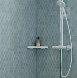 The stylish corner shelf for showers offers plenty of space for shampoo and other toiletries, so that they’re always within reach. The modern and minimalist design wows users with its distinct, bold style. It goes really well with geometric bathroom taps, such as the hansgrohe Metropol range.